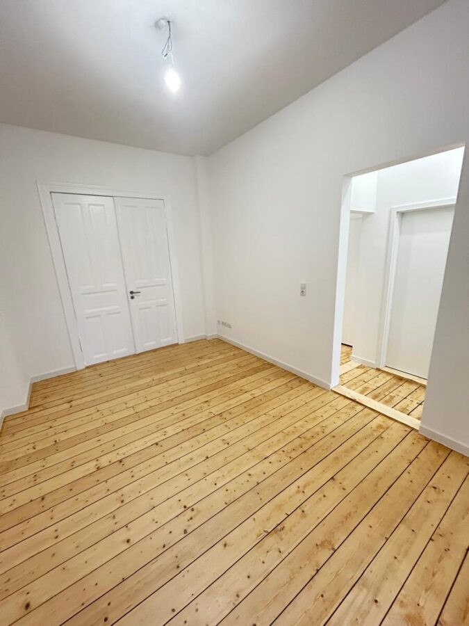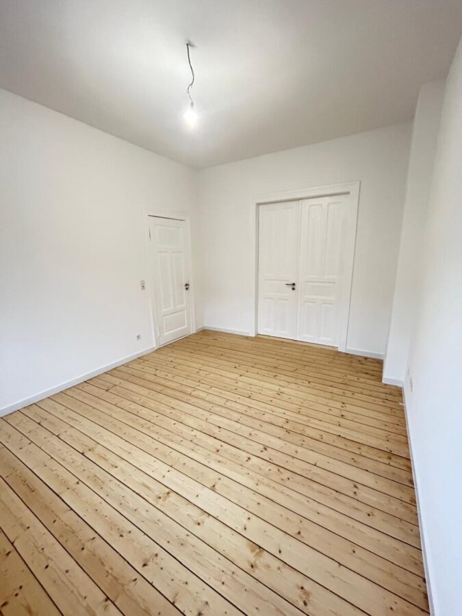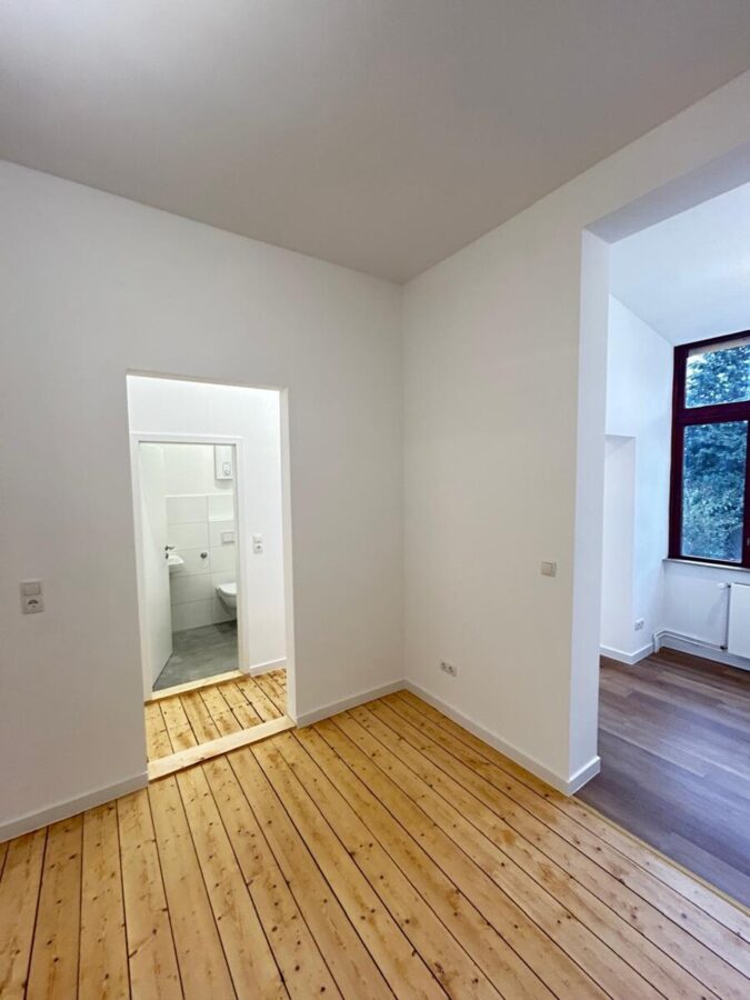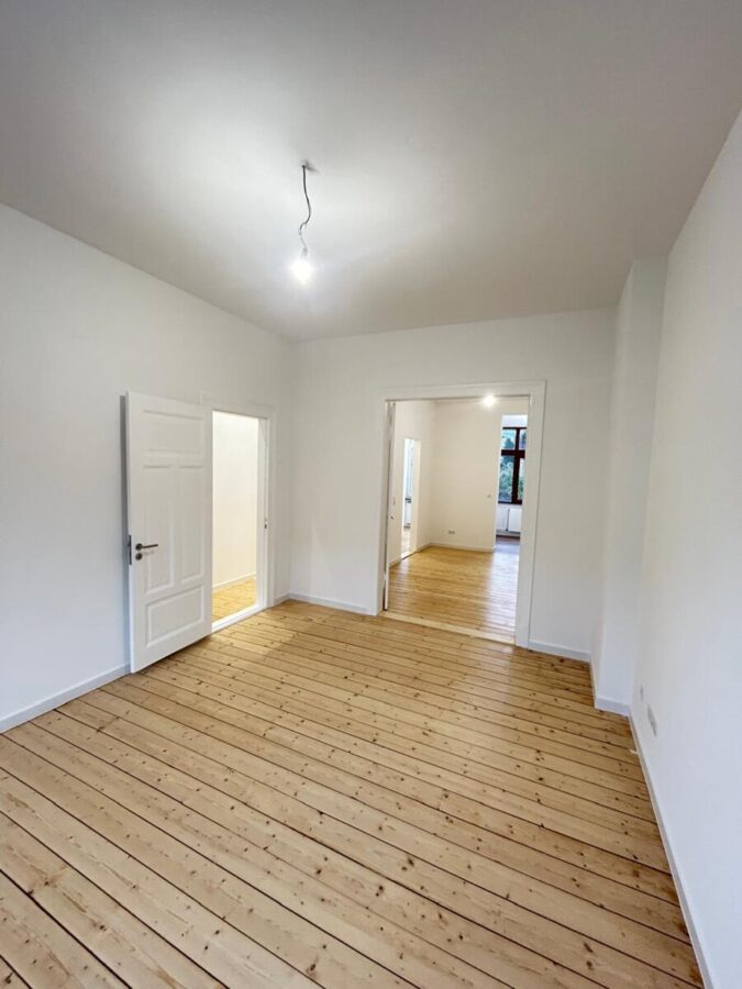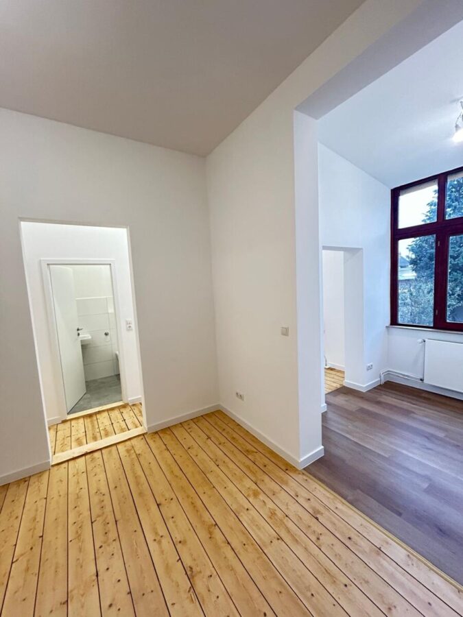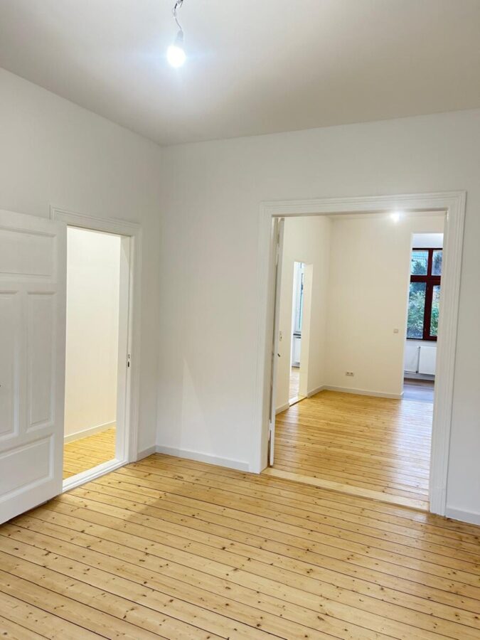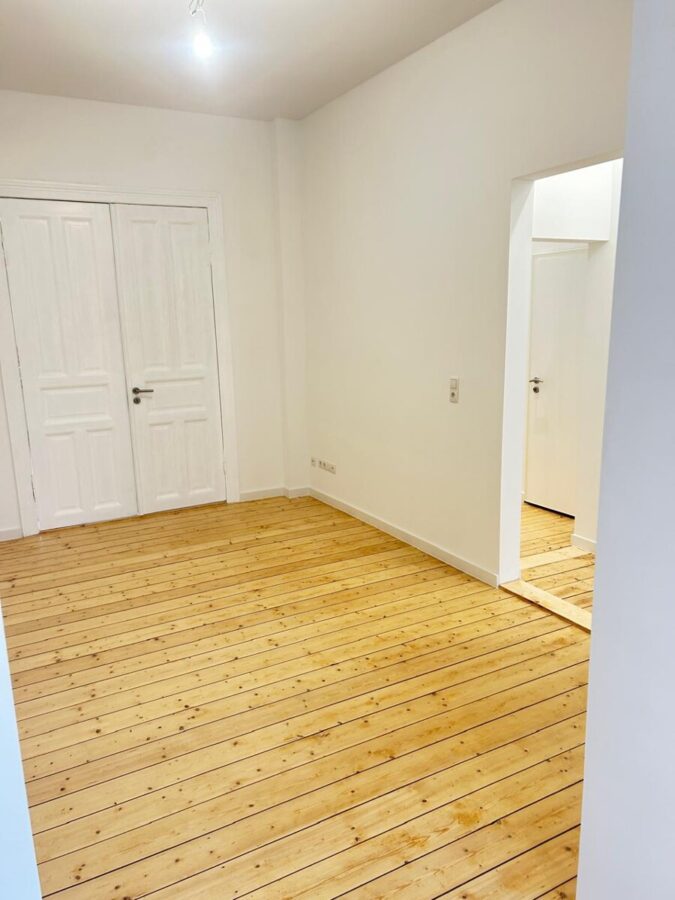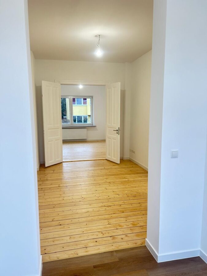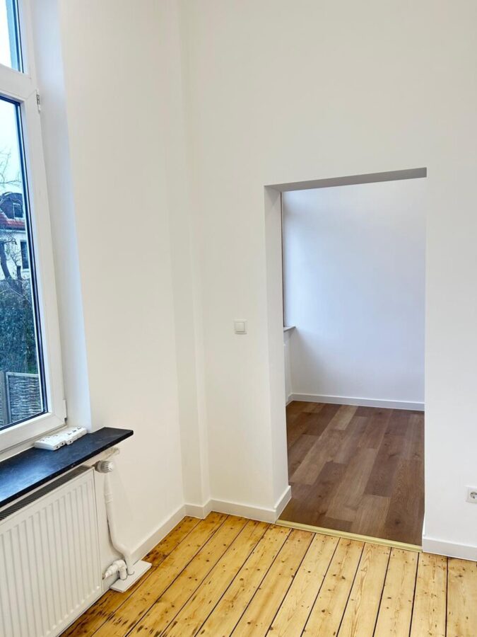 In der hier angebotenen Hochparterre-Etage ist die Atmosphäre besonders ausgeprägt. Eine große Flügeltür trennt die zwei Räume voneinander. Die hohen Decken geben diesen Räumen viel Platz für Gestaltung und Möglichkeiten der effektiven Nutzung. Dazu ziert ein schöner originaler Holzdielenfußboden die gesamte Etage bis auf den wintergartenähnlichen Anbau.