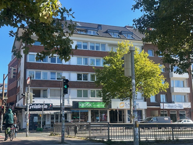 Die Räumlichkeiten befinden sich im Erdgeschoss dieses Gebäudes in Ausrichtung zu den Weserarkaden/Theaterschiff und dem Verkehrsknotenpunkt Tiefer was zum Beispiel die Sichtbarkeit betrifft.