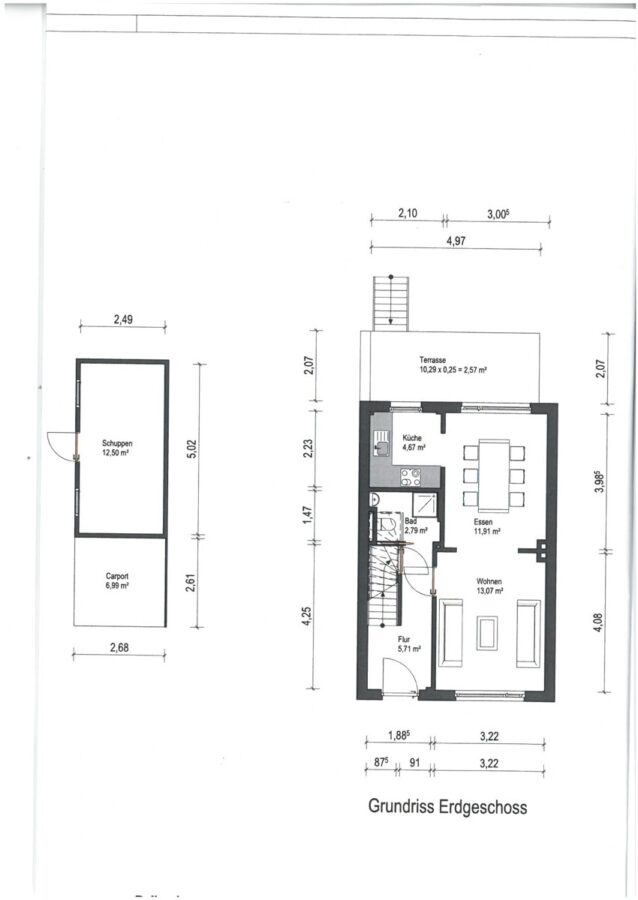Im Erdgeschoss ca. 41 m2 befindet sich ein großzügiger Wohn und Essbereich und eine eingerichtete Arbeitsküche mit Zugang zu einer Terrasse und Garten. Im Wohnzimmer befindet sich für gemütliche Winterabende ein Kaminofen. Auf dieser Etage können Sie ein modernes Duschbad von (2017) nutzen.
