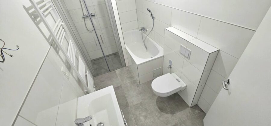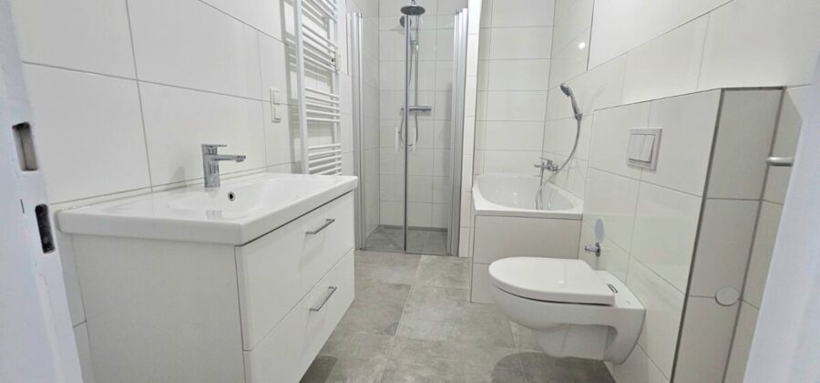 Das Bad ist komplett neu mit einer Badewanne und barrierefreier Regendusche, Waschtisch mit Unterschrank und Handtuchwärmer ausgestattet.