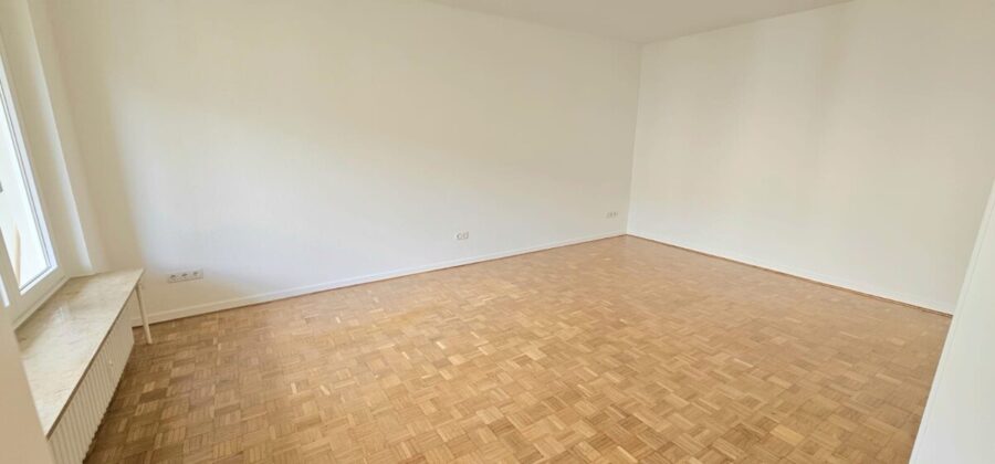 Das Stäbchenparkett im Wohnbereich wurde erhalten und restauriert abschließend neu versiegelt. Der Rest der Wohnung hat einen Fußboden in Holzoptik. Küche und Bad sind gefliest.
